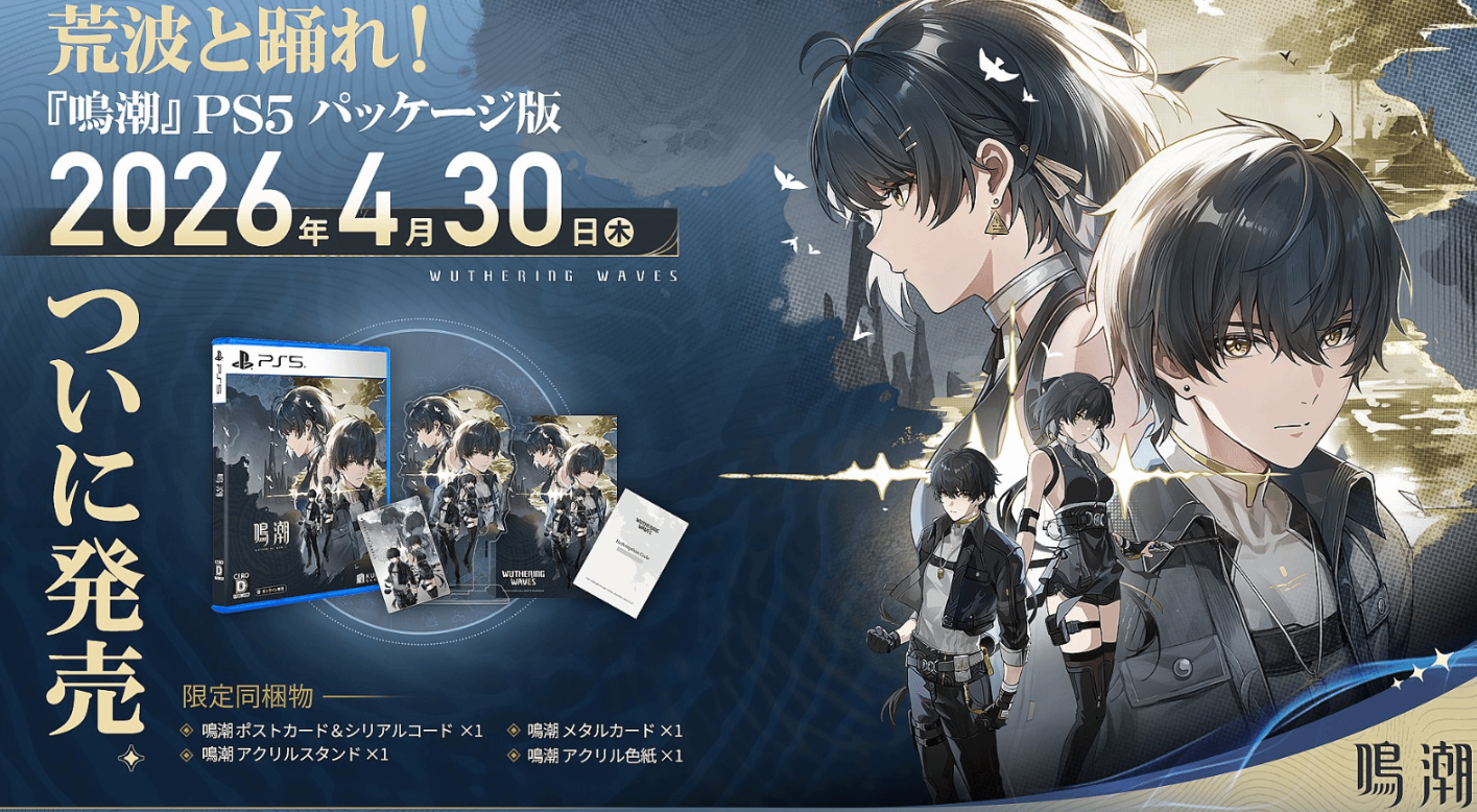 2026 年 4 月 1 日,库洛游戏正式官宣,国产开放世界 ARPG《鸣潮》PS5 豪华实体版确定于4 月 30 日率先在日本发售,全球其他地区(含港台)发售日待定。本作作为国产二次元开放世界代表作,登陆 PS5 主机后持续优化,此次实体版为系列首次。